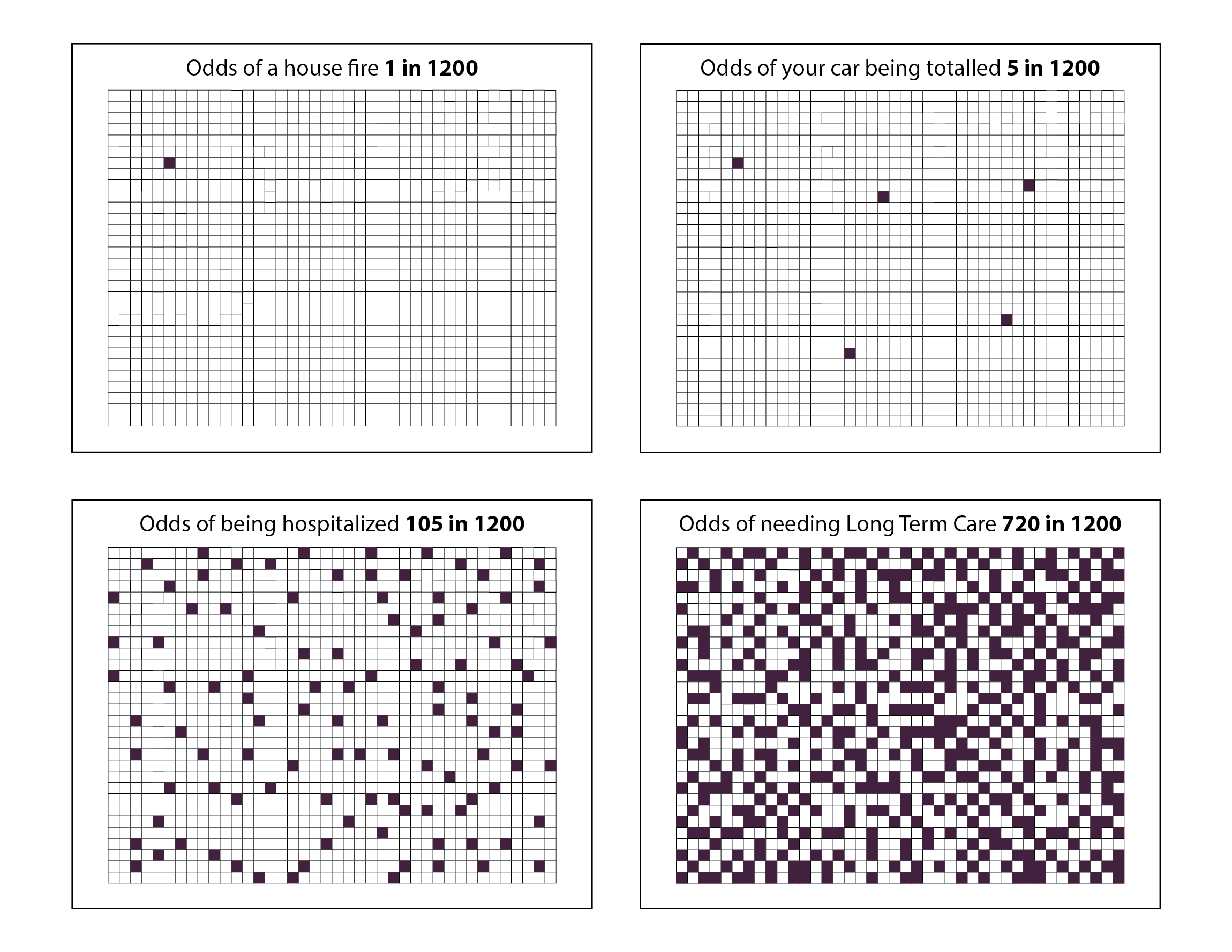 Answer: Higher than you think -- 720 in 1200 Canadians will need a Long Term Care facility. If that doesn't seem that high, compare it to the common things that people usually buy insurance for: