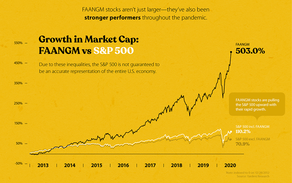 For the past five years, the big technology stocks (Facebook, Apple, Amazon, Netflix, Google and Microsoft) – collectively referred to as “FAANGM” – have been acting like a weather balloon on the stock markets. While markets as a whole have been “ok”, FAANGM stocks have shot up in their growth. And if you’ve been investing on an index, they have pulled up that index, as this chart from Visual Capitalist shows: