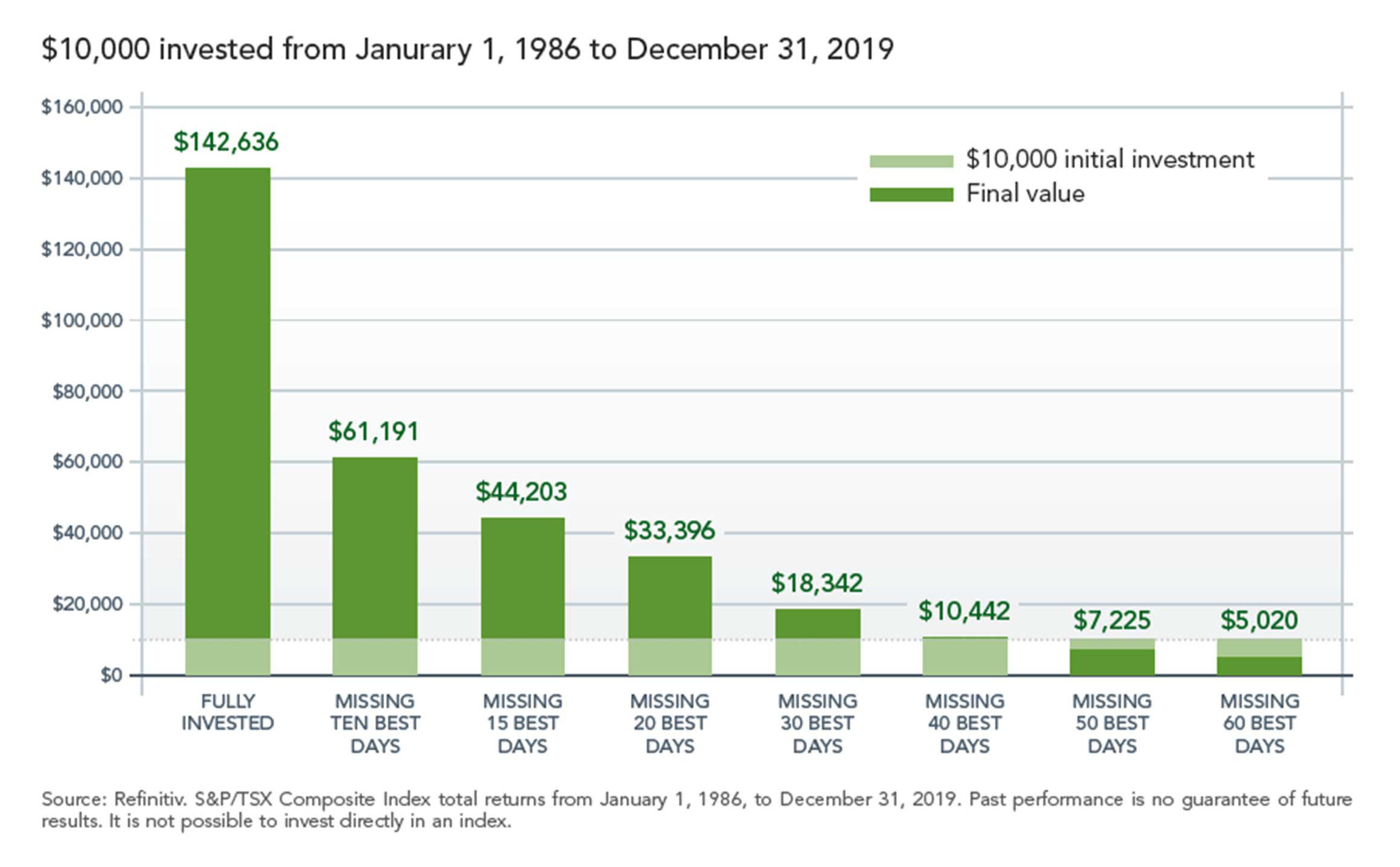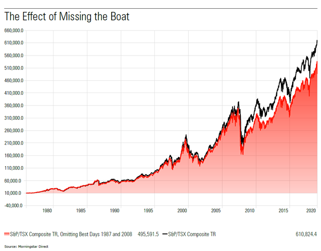 Assuming theoretical investment of $10,000 in 1977, your investment value at the peak of the market before COVID-19 would have been roughly $610,000. But if you missed the two best days in 1987 and in 2008, your portfolio would have been worth roughly $495,000. That's $115,000 (or about 19%) less than you would have made, had you been invested for those two days. That’s a significant sum for missing two days of market action - enough to put a couple of kids through undergrad.