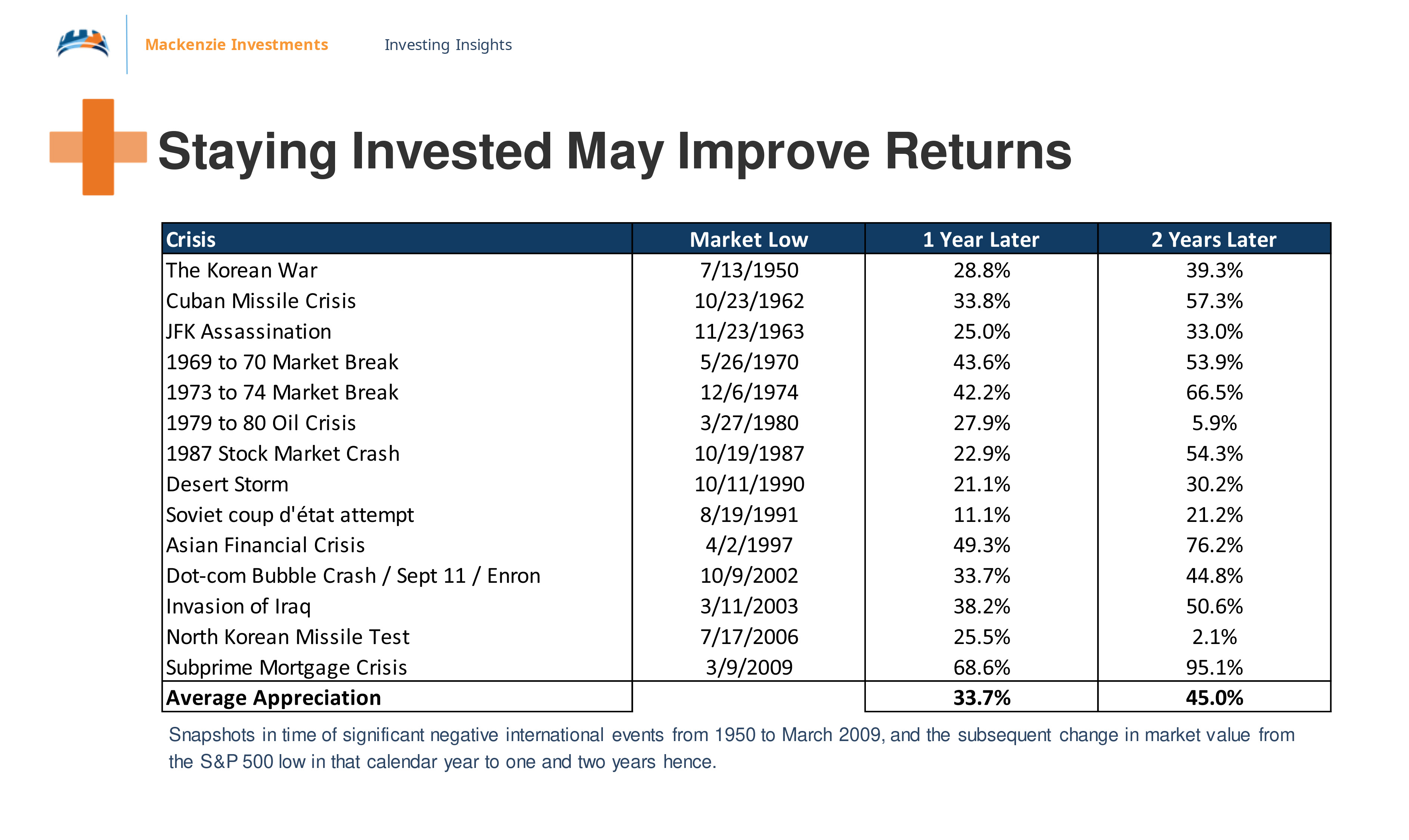 Mackenzie Investments analyzed the returns that markets have seen in market lows going back seventy years. This chart shows the lowest date on the market, and then where markets returned to from that point one year later and two years later. These are the gains that her brother will miss out on – and that she would if she moved.