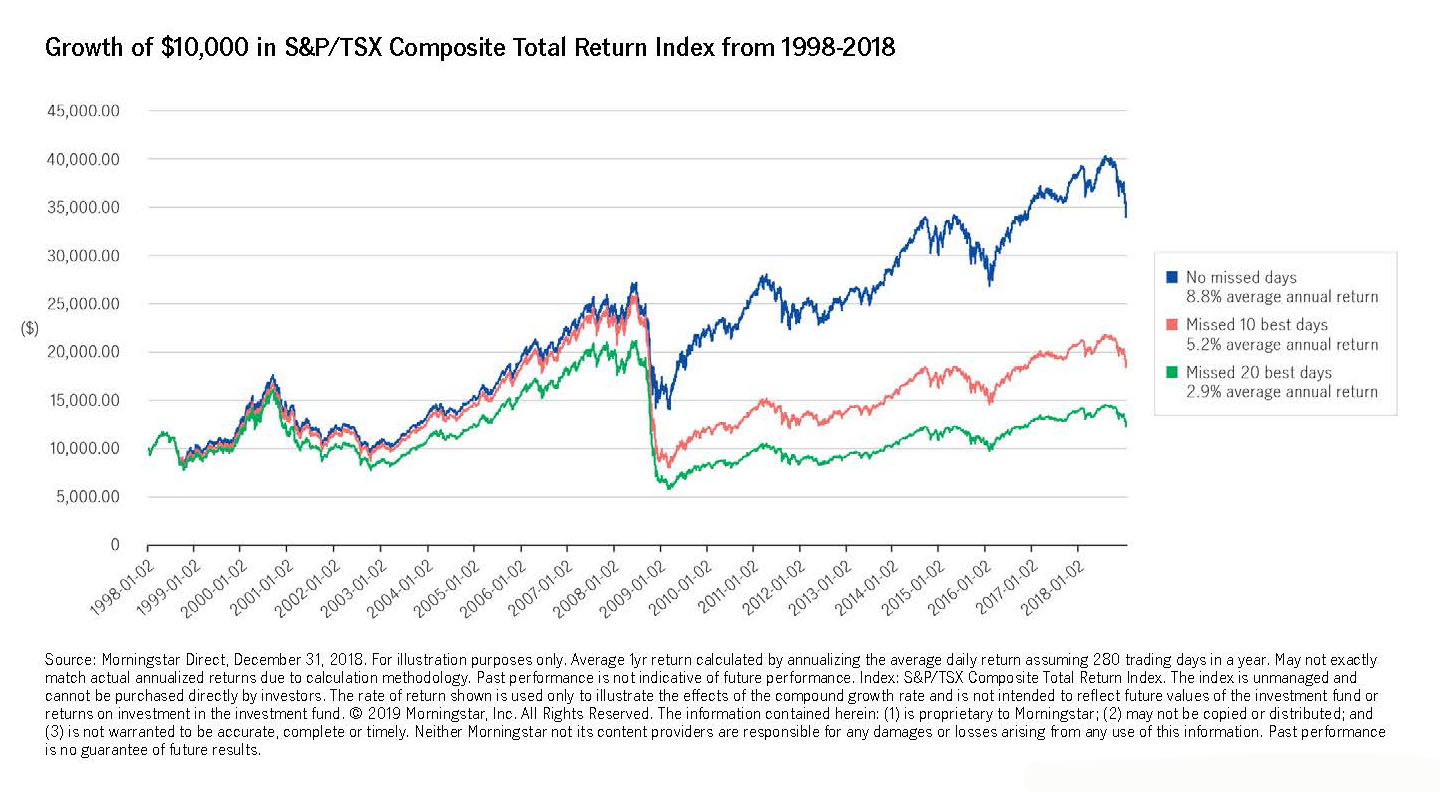 In a different Manulife/Morningstar study, they charted what $10,000 would look like if you missed a few good days since 1998. The blue line shows if you just stayed invested. The orange line is if you missed the 10 best days, and the green line if you missed the 20 best days: